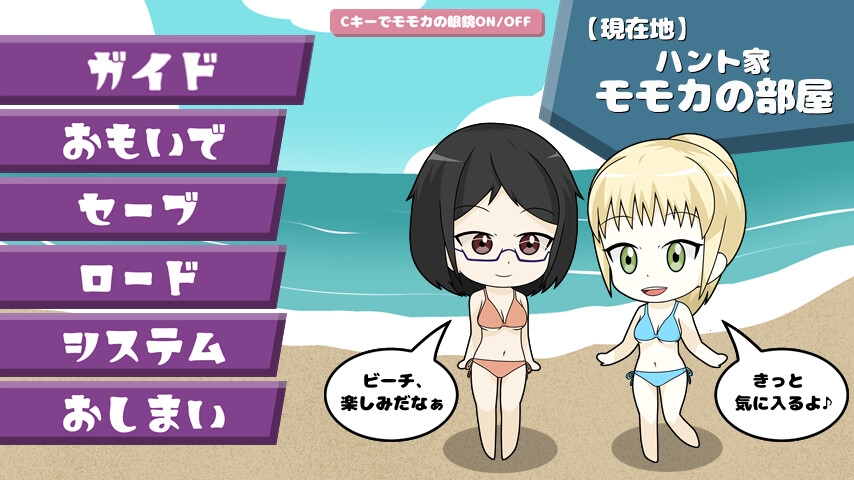メニュー画面からいつでもセーブ&ロード画面、シーン回想画面などにアクセス可能です。またCキーを押すと、モモカの眼鏡を着脱させることが出来ます。この設定は立ち絵やイベント用のイラストなどにも適用されます。